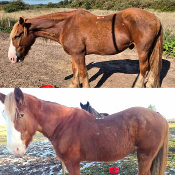 Robbie has been on a small bucket fed with Calm Healthy Horses UK 's Premium MVA which is all the essential vitamins and minerals his body needs, with added protein to support gaining and building muscle, in addition to having adlib netted hay. With time and consistency, we should start to see Robbie improve.